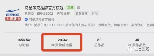 截至去年10月30日,鴻星爾克品牌官方旗艦店的抖音賬號(hào)近30天的粉絲增量為-29萬(wàn),幾乎每天掉粉一萬(wàn)。