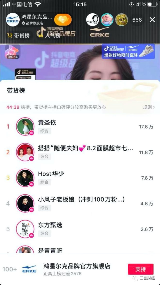 今天下午3:15,鴻星爾克品牌官方旗艦店的抖音直播間在線觀看人數(shù)只有658人,在帶貨榜的排名也在100名以后。