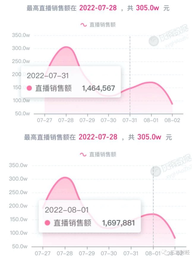 也就是說(shuō),紅星爾克7.31和8.31兩天的直播銷(xiāo)售額在近7天內(nèi)約占1/4,并沒(méi)有什么特別的表現(xiàn)。