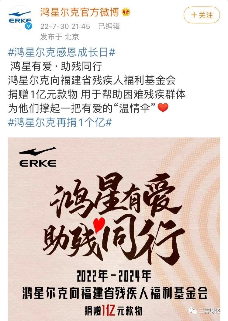 據(jù)其官方微博描述,鴻星爾克此次向福建省殘疾人福利基金會(huì)捐贈(zèng)1億元款物,用于幫助困難殘疾群體。