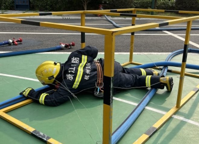 下午3點(diǎn)半,消防員們正穿著消防服,背著重達(dá)50-60斤的裝置進(jìn)行“安全行進(jìn)穿越”訓(xùn)練演習(xí)。他們戴上頭套,在模擬黑暗火場的環(huán)境下,摸索著水管,穿過重重阻礙,撤離火場。高溫對消防員而言,僅是一方面的考驗(yàn),未知的黑暗環(huán)境,更是心理上的考驗(yàn)。00后隊(duì)員,完成任務(wù)后摘下頭罩,露出滿是壓痕的臉龐,喘著粗氣,豆大的汗滴一滴一滴落下。這樣的場景,一日一日在重復(fù)著。