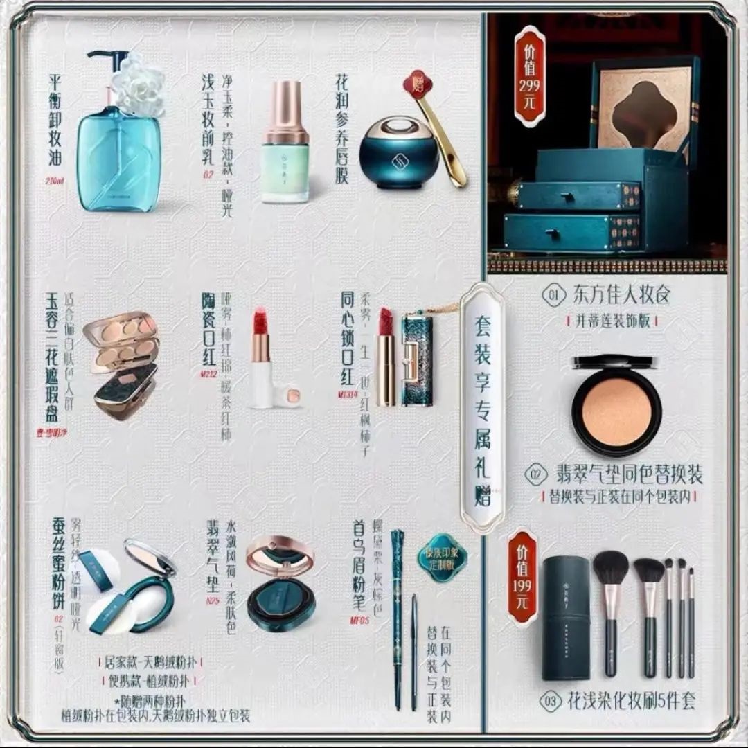 就拿今年七夕的花西子禮盒來說吧,價格從699元到1314元不等。最貴的1314元套裝,包括卸妝油、妝前乳、氣墊、蜜粉餅、遮瑕盤、口紅、唇膜、眉筆、化妝刷和一個宣稱價值299元的化妝盒。