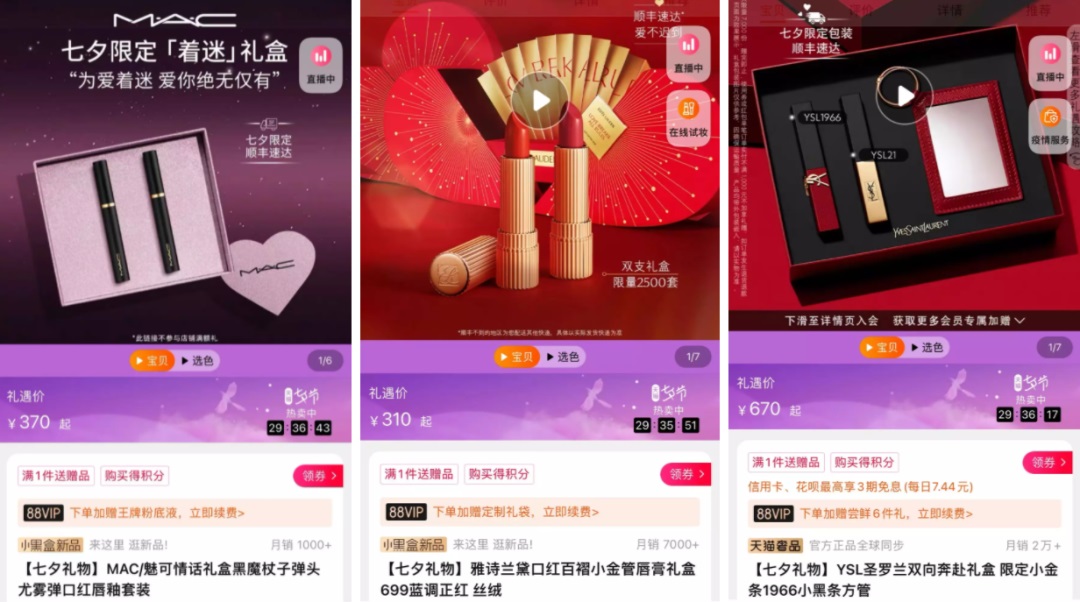 比如,MAC、阿瑪尼、雅詩蘭黛、YSL,今年七夕都推出了內(nèi)含兩到三支經(jīng)典色號口紅的限定禮盒,價格分別是370元、520元、620元和730元;NARS的口碑產(chǎn)品“腮紅+唇釉”套裝禮盒,售價520元;雅詩蘭黛、蘭蔻等品牌還推出了更實用的全明星護膚禮盒,售價也不到千元。