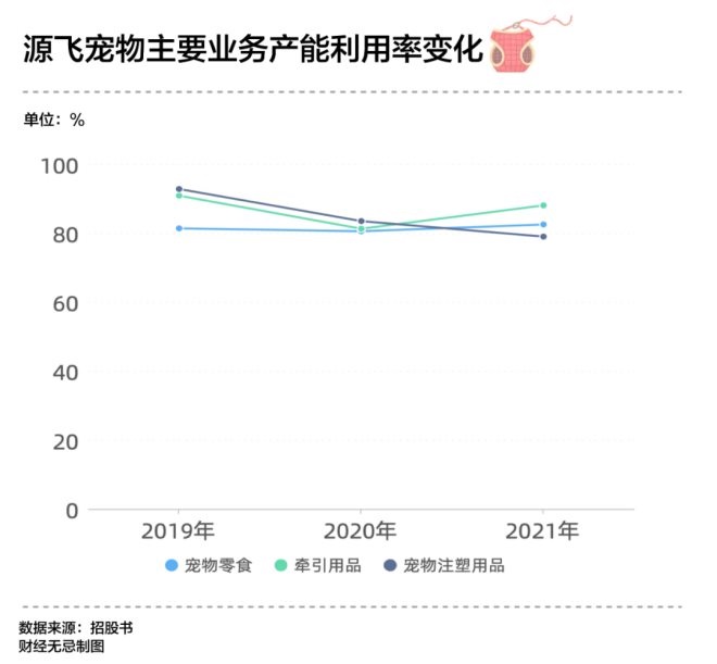 招股書顯示,牽引用具的產(chǎn)能利用率從2019年度的90%下降到2021年的88.04%,而寵物零食的產(chǎn)能利用率也僅在80%上下。
