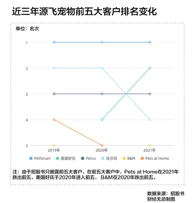 從前五大客戶業(yè)務(wù)占比來看,PetSmart為源飛寵物的第一大客戶,占比從2019年的18.99%上升到2021年的26.51%。