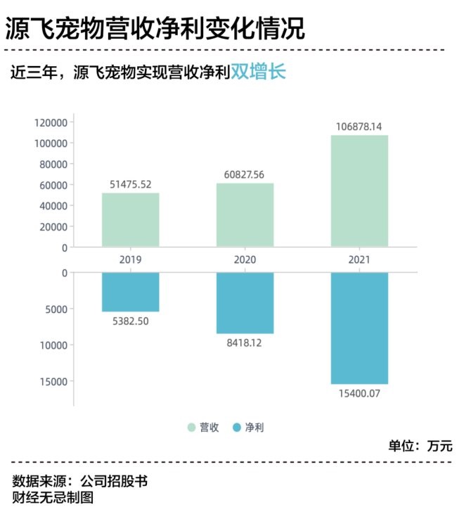 在利潤端,2019年至2021年,源飛寵物凈利潤從5000多萬上升到1.5億元。橫向?qū)Ρ葋砜矗?021年中寵股份凈利為1.16億元,而佩蒂股份凈利則僅為0.6個(gè)億。