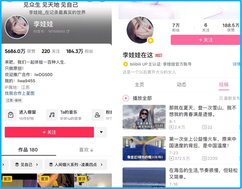 像李娃娃一樣的創(chuàng)作者越來越多,他們不再迷戀做單一內(nèi)容平臺(tái)的頭部達(dá)人,一旦摸索出了“走紅路徑”,就會(huì)將這種方法論應(yīng)用到其他平臺(tái),從而沉淀下更多流量。