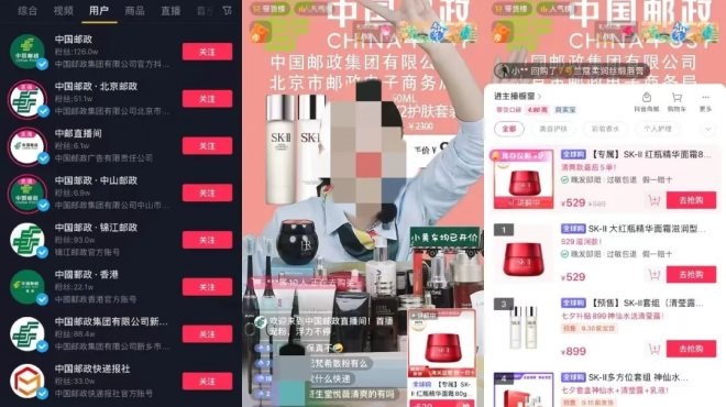此外,新消費Daily注意到,中國郵政近日也開始涉足直播帶貨。今天上午,新消費Daily在抖音搜索中國郵政,出現(xiàn)了數(shù)十個相關(guān)賬號,且多個已在開播狀態(tài)。大多數(shù)直播間的賬號主體是中國郵政的各地分公司。