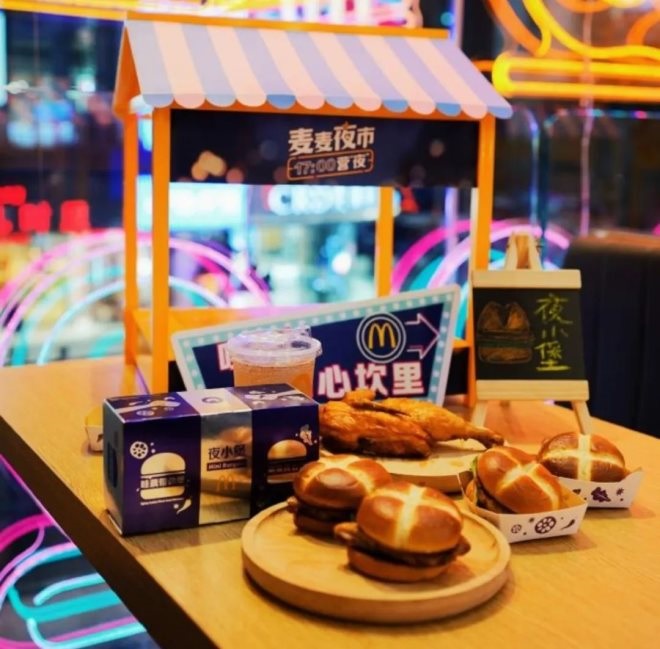 前有肯德基賣夜宵,推出僅限晚上20點(diǎn)到次日凌晨6點(diǎn)供應(yīng)的“燒烤風(fēng)味香嫩雞肉串”和“醬香Q彈魷魚串”等新品;后有麥當(dāng)勞“麥麥夜市”開張,推出夜小堡、雞架等專屬菜單。