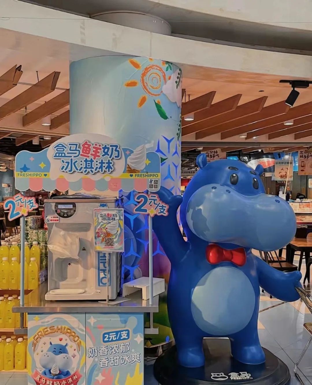 水果甜品區(qū):飯后再來點(diǎn)鮮切水果以及甜品,盒馬推出了自己鮮奶冰淇淋,兩元一個(gè),還有具有盒馬標(biāo)志性的“屁股臉”雪糕。