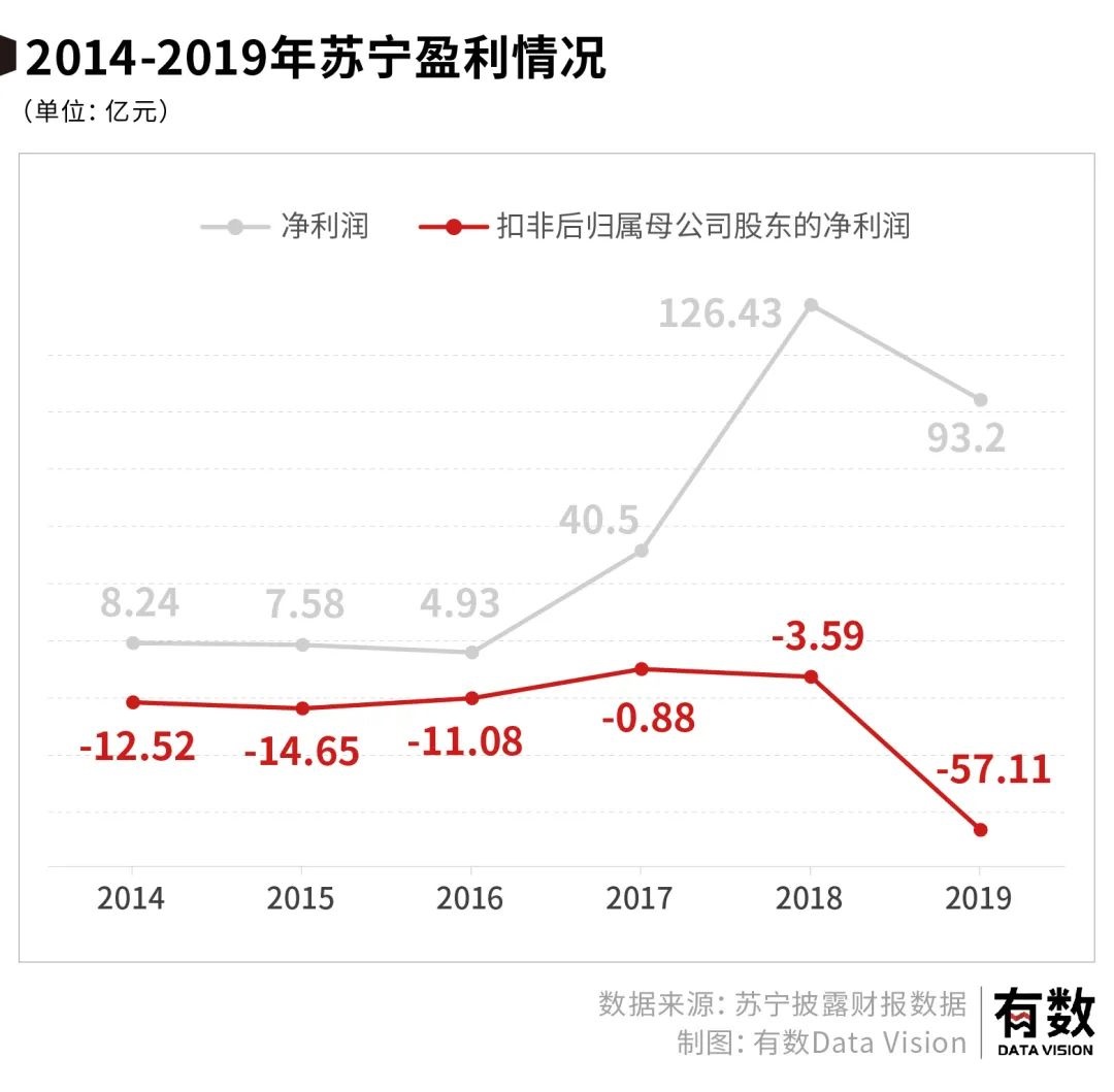 但這同樣也是如今被稱為ST易購(gòu)能夠維持賬面風(fēng)光的最后一年。自2014年以來(lái),扣除非經(jīng)常性損益后的蘇寧再?zèng)]賺過(guò)一分錢(qián)。