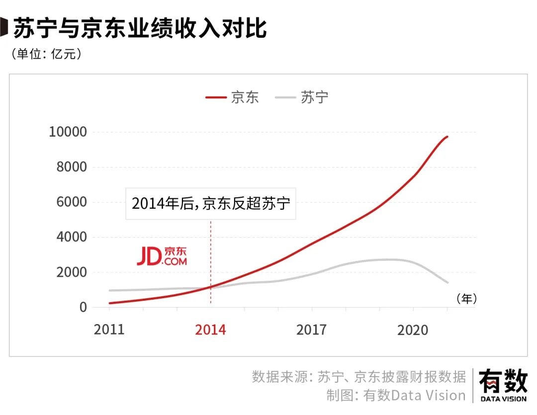 2014年蘇寧的成交額是1089億元,京東則以1150億的成績(jī)首次超過(guò)蘇寧。兩年后,京東的成交額更是達(dá)到了蘇寧的兩倍。
