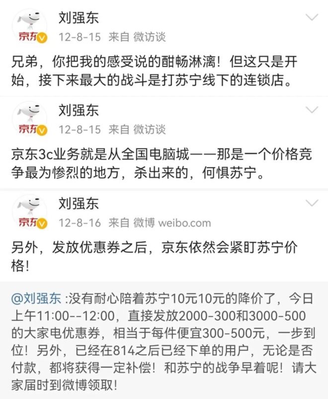 劉強(qiáng)東在微博上稱,未來(lái)三年內(nèi)大家電產(chǎn)品零利潤(rùn)。京東還把一間會(huì)議室命名為“打蘇寧指揮部”,劉強(qiáng)東親自掛帥,其余的市場(chǎng)、公關(guān)、銷(xiāo)售、大家電部門(mén)成員,時(shí)刻關(guān)注價(jià)格戰(zhàn)動(dòng)態(tài)并制定策略。