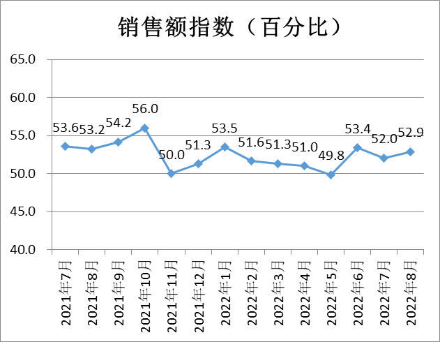 銷售額指數(shù)為52.9%,較上月微升0.9個百分點,表明商品經(jīng)營類企業(yè)認(rèn)為本月銷售狀況環(huán)比將變好。