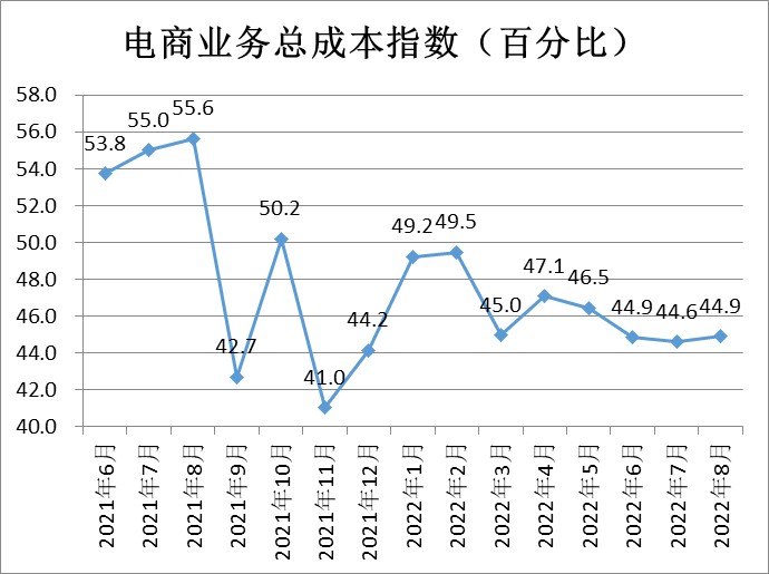 電商業(yè)務(wù)總成本反向指數(shù)為44.9%,較上月微升0.3個百分點,依然處于收縮區(qū)間,結(jié)合調(diào)研問卷反饋,分析認(rèn)為電商企業(yè)持續(xù)投入,技術(shù)改造、人員培訓(xùn)和渠道擴(kuò)充的意愿明顯,是成本仍然相對較高的重要原因。
