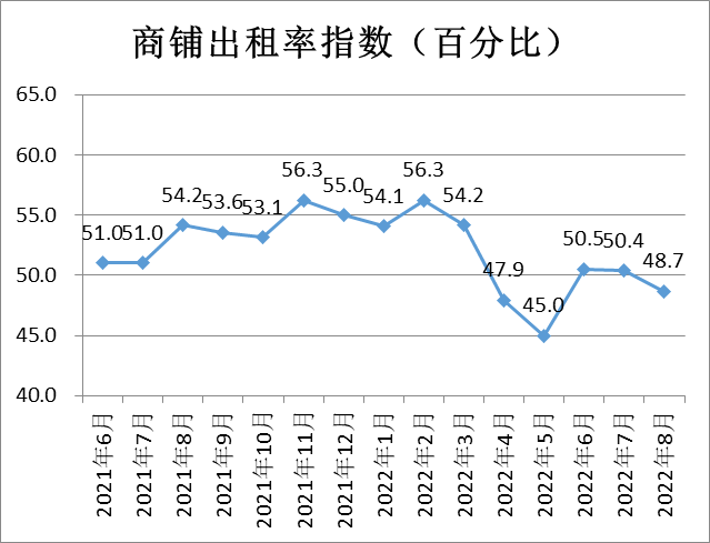商鋪出租率指數(shù)為48.7%,較上月小幅下降1.7個百分點,降至收縮區(qū)間,表明商鋪出租難度略有加大,對照2021年同期數(shù)據(jù),出租率下降需要關(guān)注。