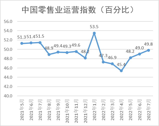 2022年7月份,中國零售業(yè)運營指數(shù)1為49.8%,較上月繼續(xù)微升0.8個百分點,維持緩慢復(fù)蘇勢頭,恢復(fù)至去年三四季度以來的較高水平。