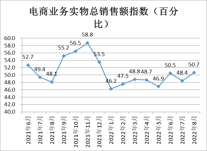 電商業(yè)務(wù)實物總銷售額指數(shù)為50.7%,較上月小幅上升2.3個百分點,表明線上零售對本月銷售預(yù)期變好。