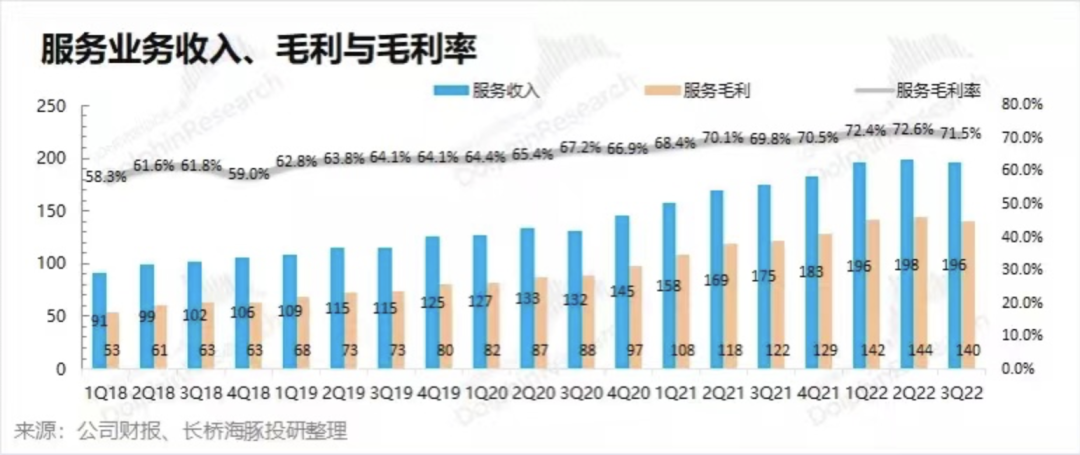 而且,相較于蘋果硬件產(chǎn)品34.5%的毛利潤(rùn)率,服務(wù)業(yè)務(wù)的毛利潤(rùn)率達(dá)到71.5%。據(jù)長(zhǎng)橋海豚投研整理的數(shù)據(jù)顯示,服務(wù)業(yè)務(wù)毛利潤(rùn)率從2018年第一季度至今一直超過50%,且保持穩(wěn)定增長(zhǎng)趨勢(shì)。