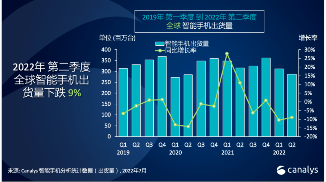 市場(chǎng)數(shù)據(jù)分析機(jī)構(gòu)Canalys發(fā)布的數(shù)據(jù)顯示,2022年第二季度,全球智能手機(jī)出貨量下跌9%,減少至2.87億臺(tái),是疫情爆發(fā)以來,2020年第二季度后的季度最低點(diǎn)。