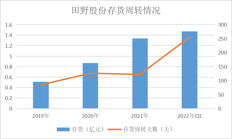 2019年~2021年,田野股份的存貨賬面價(jià)值分別為5059萬(wàn)元、8686萬(wàn)元和1.34億元,占總資產(chǎn)的比例分別為5%、9%和11%,金額不僅大還呈現(xiàn)逐年增長(zhǎng)態(tài)勢(shì)。根據(jù)Wind數(shù)據(jù),其存貨周轉(zhuǎn)天數(shù)已經(jīng)從2019年的84.75天,增至2021年的122.28天,2022年一季度的255.32天。