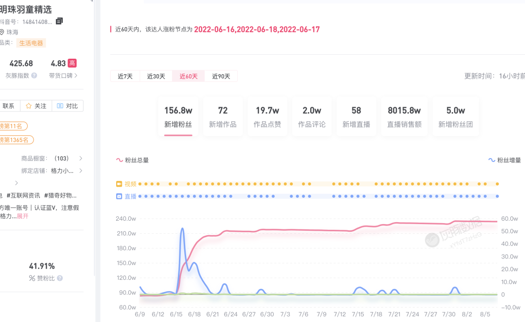 去年11月22日,“明珠羽童精選”發(fā)布了第一條視頻,8天時(shí)間,賬號(hào)漲粉至10萬。但此后,粉絲增長(zhǎng)緩慢,據(jù)灰豚數(shù)據(jù),至5月31日,該賬號(hào)粉絲增長(zhǎng)至67萬。6月至今,“明珠羽童精選”粉絲已漲至234萬。銷售數(shù)據(jù)方面,自6月9日至今的60天時(shí)間,“明珠羽童精選”直播銷售額達(dá)到8015.8萬元。