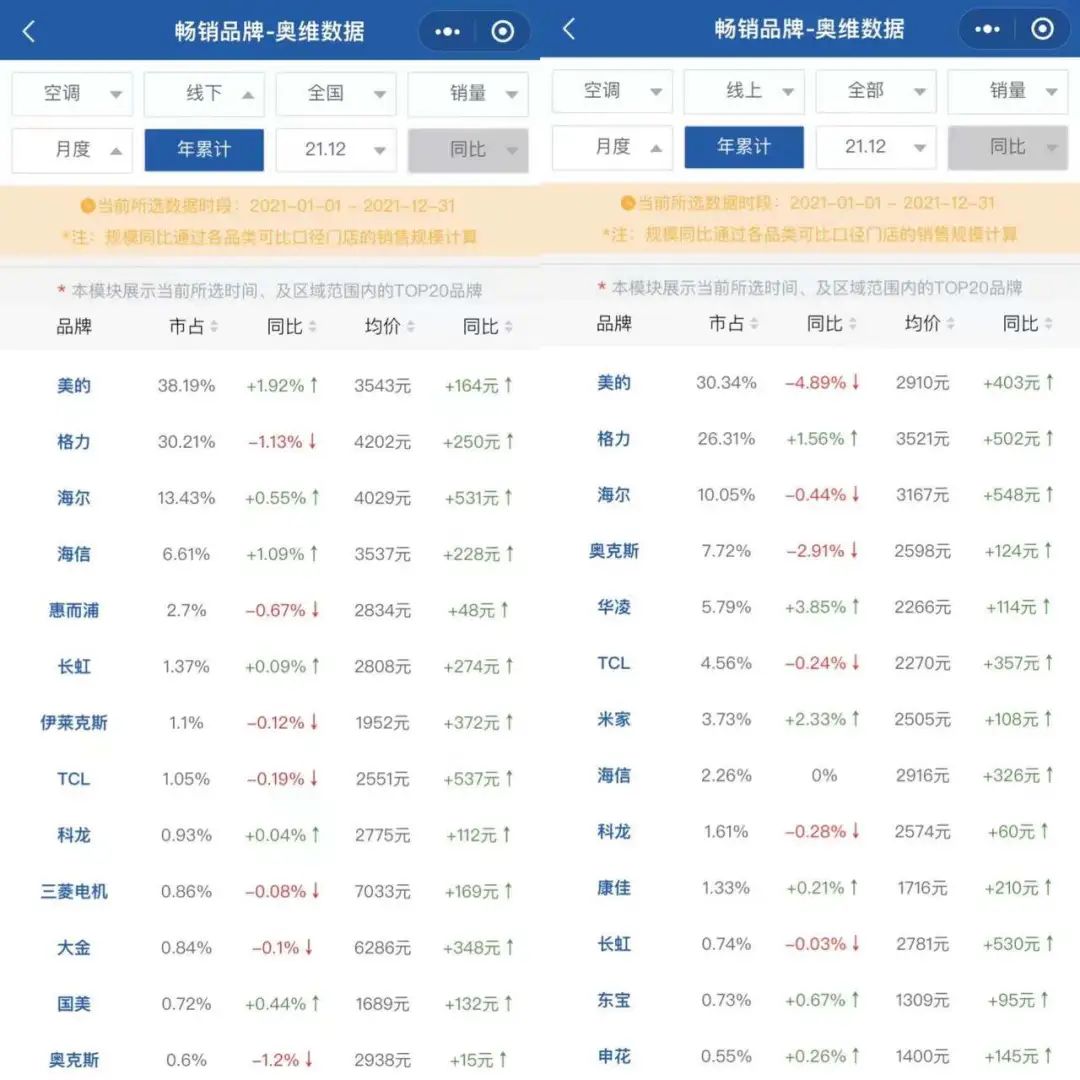 線下渠道萎縮,急需拓展線上渠道,是董明珠需要解決的問題。奧維羅盤數(shù)據(jù)顯示,2021年,無論是線上還是線下,美的空調(diào)的銷量均超越格力,位居第一。其中,美的空調(diào)的線上銷量市場(chǎng)占有率為30.34%,格力為26.31%。美的空調(diào)線下的銷量市場(chǎng)占有率為38.19%,格力同比下降1.13%,以30.21%的市場(chǎng)份額位于第二名。