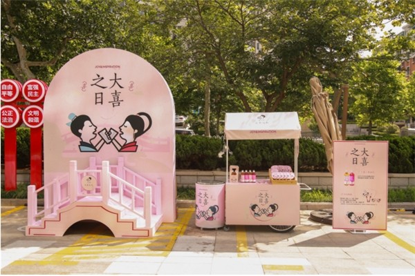 為了讓新人“喜上加喜”,感受濃厚的傳統(tǒng)七夕節(jié)氛圍,喜茶聯(lián)合杭州、重慶、廣州、武漢、青島5個城市的民政部門推出“七夕節(jié)送喜”活動,不僅在活動現(xiàn)場搭建了歡喜鵲橋、七囍花車,還為當天到民政部門辦理結婚登記的新人免費送出喜茶爆汁楊梅綠妍果汁茶、地中海桃桃金鳳果汁茶,以及七夕限定扇子和徽章禮品,令不少到場的新人驚喜不已。