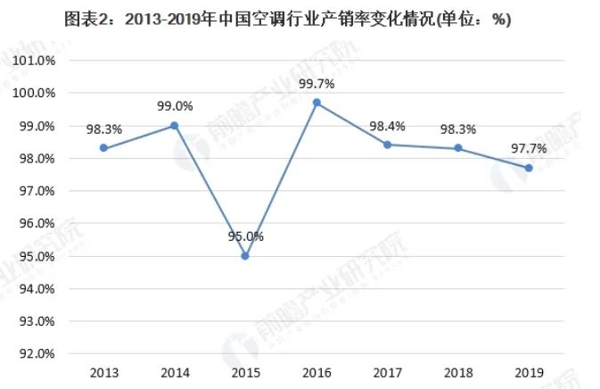 而整個空調(diào)行業(yè)也不太景氣,已進(jìn)入下行周期。根據(jù)國家統(tǒng)計(jì)局公布的數(shù)據(jù)顯示,2013-2019年我國空調(diào)產(chǎn)量和銷量逐年增長,但2017年以來,我國空調(diào)銷量開始低于產(chǎn)量,行業(yè)產(chǎn)銷率逐年下滑,2019年我國空調(diào)產(chǎn)量為21866萬臺,超出銷量500萬臺,產(chǎn)銷率為97.9%,行業(yè)存在產(chǎn)能過剩的問題。