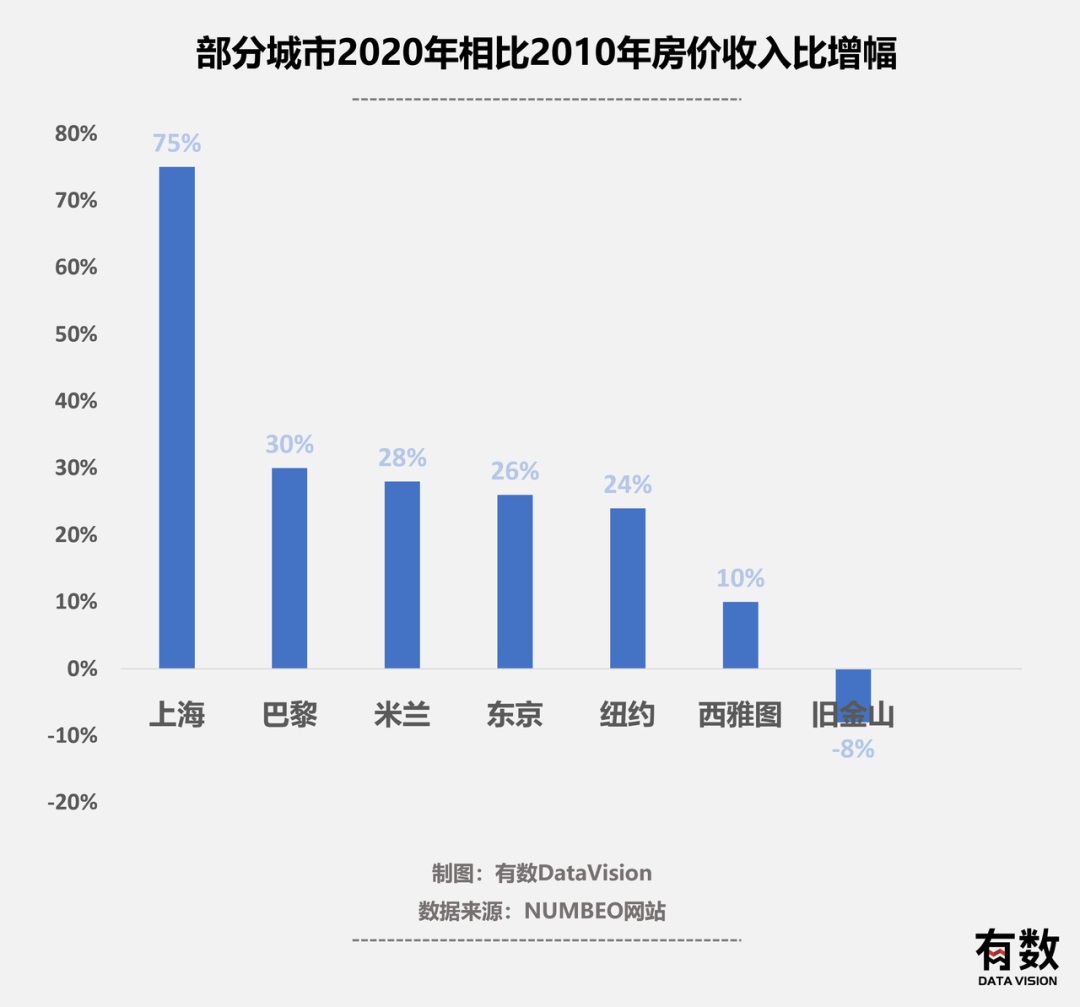 對比近十年全球各大城市的房價收入比增幅,上海的增幅高達75%,一騎絕塵。