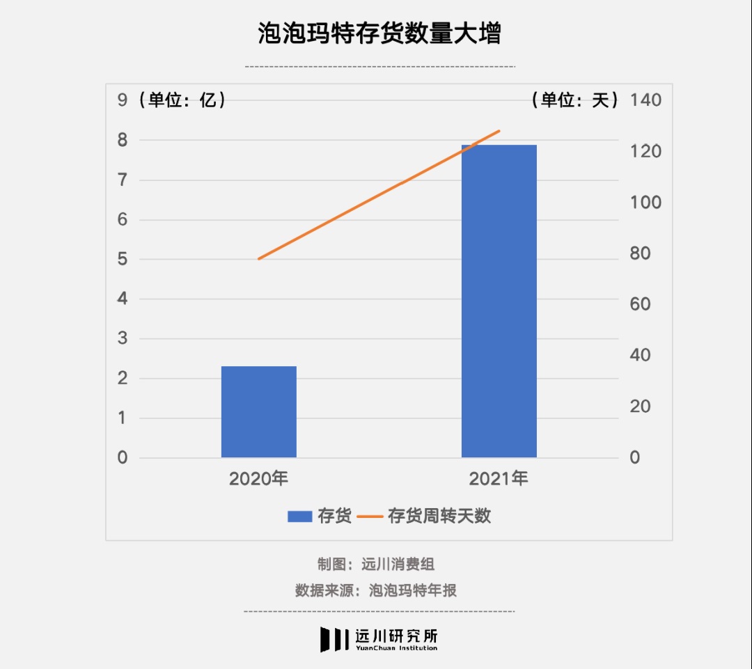 截至2020年上半年[3],泡泡瑪特旗下共運(yùn)營(yíng)85個(gè)IP,包括12個(gè)自有IP、22個(gè)獨(dú)家IP和51個(gè)非獨(dú)家IP。而與之相伴的則是2021年泡泡瑪特的存貨從2.3億元激增至7.9億元,翻了兩倍不止。同時(shí),庫(kù)存周轉(zhuǎn)天數(shù)也從78天增加至128天。