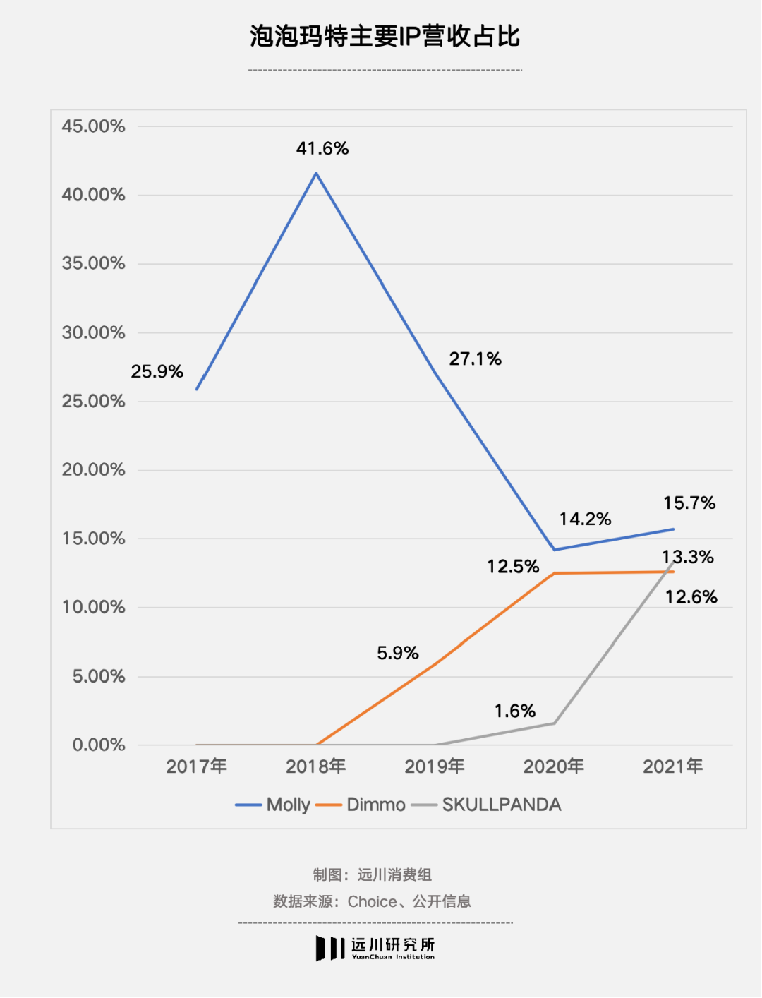 目前,Molly系列仍為泡泡瑪特營(yíng)收占比最大的IP,占比15.7%。在喊了幾年“自己是一家IP培養(yǎng)公司”后,到了2021年,Dimoo和SKULLPANDA這兩個(gè)IP眼看著也快要追平了Molly,分別創(chuàng)下了5.67億元和5.95億元的營(yíng)收,占比12.6%和13.3%。