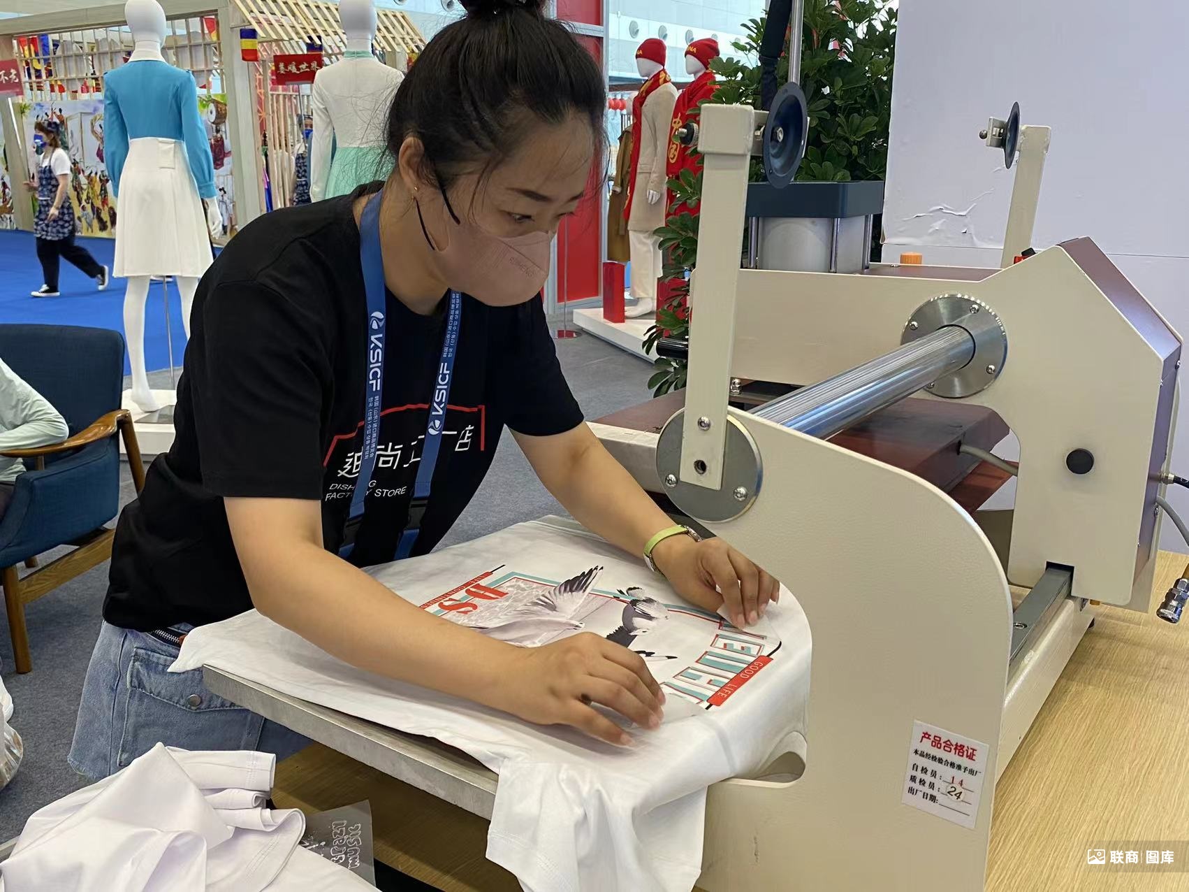 此外,服飾品牌迪尚搬來了一臺熱轉(zhuǎn)印燙畫機(jī),直觀向大家展示熱轉(zhuǎn)印工藝,吸引不少參展者觀看,還有參展者選擇自己喜歡的圖案制作衣服,非常具有參與感。