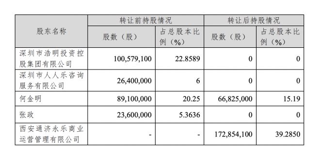 浩明集團有意通過協(xié)議轉(zhuǎn)讓所持上市公司所持流通股100579100股(占上市公司股份總數(shù)的22.8589%);人人樂咨詢公司有意通過協(xié)議轉(zhuǎn)讓所持上市公司流通股26400000股(占上市公司股份總數(shù)的6%);大股東何金明有意通過協(xié)議轉(zhuǎn)讓所持上市公司流通股22275000股(占上市公司股份總數(shù)的5.0625%);大股東張政有意通過協(xié)議轉(zhuǎn)讓所持上市公司流通股23600000股(占上市公司股份總數(shù)的5.3636%);合計轉(zhuǎn)讓股份172854100股(占上市公司股份總數(shù)的39.2850%)。