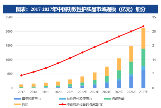 國海證券數(shù)據(jù)顯示,重組膠原蛋白護膚品是我國功效性護膚品中增速最快的賽道。2021年我國功效性護膚品市場規(guī)模達308億元,其中重組膠原蛋白護膚品市場規(guī)模達46億元,至2027年有望達645億元。