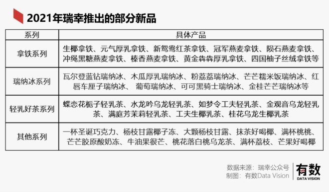 2021年全年,瑞幸共推出了113款全新現(xiàn)制飲品,隔壁奈雪的茶2021年共推出41款,瑞幸出新款的速度是其三倍。