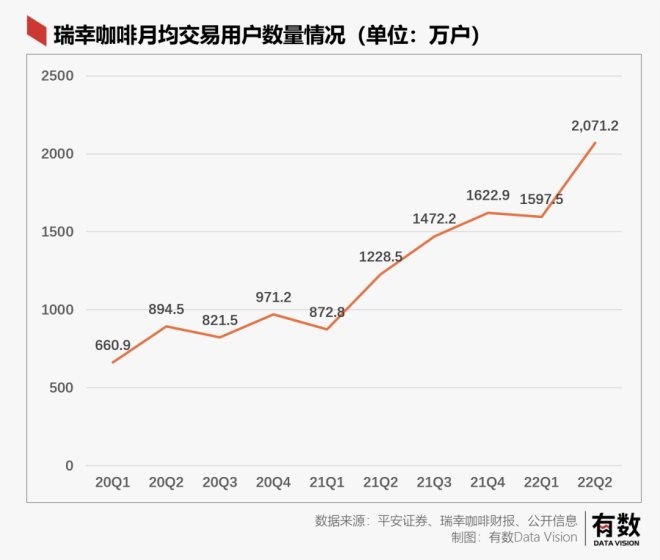 但瑞幸,在推出生椰拿鐵的同季度,月均交易用戶便突破新高,并呈現(xiàn)出持續(xù)增長的趨勢。