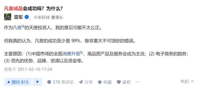 作為凡客天使投資人的雷軍在2011年年初表示,“凡客的成功至少是 99%,除非重大不可饒恕的錯(cuò)誤!