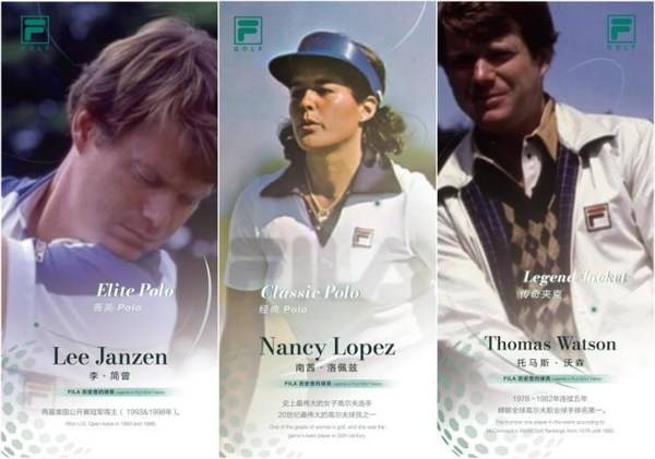 FILA GOLF歷史簽約球員,從左至右依次為:Lee Janzen, Nancy Lopez, Thomas Watson