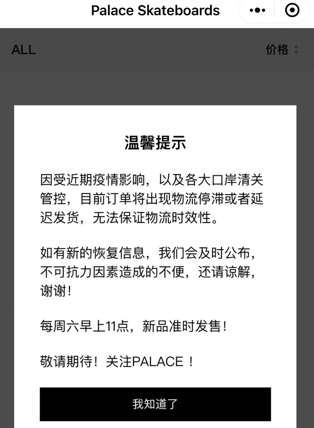 根據(jù)媒體公開報道,Palace Skateboards在國內(nèi)沒有倉庫。受到疫情影響,產(chǎn)品訂單出現(xiàn)了物流停滯或延遲發(fā)貨問題。