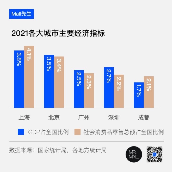 其中,作為國內(nèi)四大一線城市之一的深圳,盡管經(jīng)濟(jì)發(fā)展水平領(lǐng)先全國,但消費(fèi)市場卻始終沒能充分培育起來,其在全國社會(huì)消費(fèi)品零售總額中的比重,長年顯著低于GDP占比,與上海、成都等形成鮮明對比。