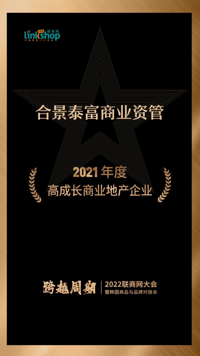 近日,繼榮獲“年度商業(yè)地產(chǎn)創(chuàng)新推動潮企業(yè)”榮譽后,合景泰富商業(yè)資管憑借商業(yè)運營綜合實力、持續(xù)的商業(yè)項目價值創(chuàng)造力和品牌價值輸出,在2022聯(lián)商網(wǎng)大會頒獎盛典上再奪“2021年度高成長商業(yè)地產(chǎn)企業(yè)”殊榮。
