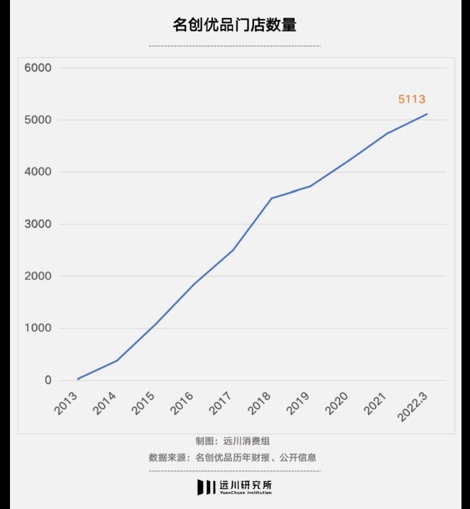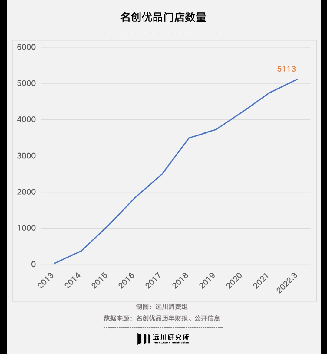因此,2013年只有27家門店的名創(chuàng)優(yōu)品五年后開到了3500家門店,翻了130倍,平均每年開店700家[2]。2022年,這一數(shù)字增長至5000多家,名創(chuàng)優(yōu)品用9年的時間就完成了前輩大創(chuàng)百貨用46年才完成的事情。
