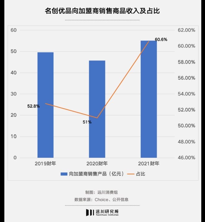 畢竟在名創(chuàng)優(yōu)品的收入構(gòu)成中,占比最大的一項(xiàng)為“向加盟商銷售產(chǎn)品”,過去三年,該項(xiàng)目占比均超過營收的一半以上,在2021財年達(dá)到60.6%。
