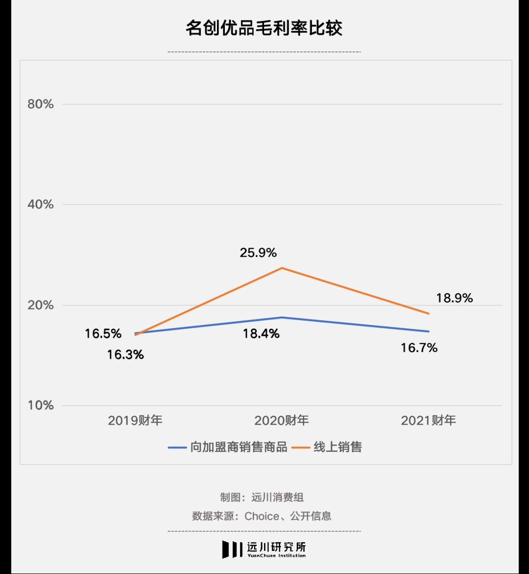 這一趨勢愈演愈烈的2021財年,名創(chuàng)優(yōu)品線上銷售額已經(jīng)約占總銷售額的10%。毛利率方面,線上銷售也實(shí)現(xiàn)了對線下加盟商的反超,2021財年達(dá)到18.9%;去年下半年更進(jìn)一步達(dá)到22.3%,比線下加盟商渠道高4.5個百分點(diǎn)。