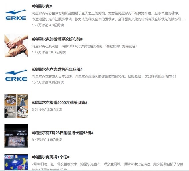 捐贈(zèng)事件過(guò)后,“鴻星爾克的會(huì)員被充到了2140年”“鴻星爾克董事長(zhǎng)否認(rèn)瀕臨破產(chǎn)”等多個(gè)話題輪番霸占微博熱搜榜,鴻星爾克似乎一下子再現(xiàn)輝煌,重新成為了當(dāng)年那個(gè)家喻戶曉的品牌。除此之外,大量媒體對(duì)鴻星爾克進(jìn)行了連篇累牘的報(bào)道,許多官方媒體如人民日?qǐng)?bào)評(píng)論、中國(guó)新聞網(wǎng)也對(duì)其表示了正面肯定和支持。