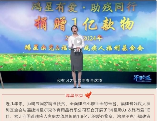 除此之外,鴻星爾克過(guò)往在公益捐贈(zèng)上投入的“量”也需要引起注意。從數(shù)額上看,鴻星爾克捐贈(zèng)動(dòng)輒投入500萬(wàn)、2000萬(wàn),去年讓鴻星爾克爆火出圈的那次更是捐出了5000萬(wàn)。最近這次一億捐贈(zèng)項(xiàng)目的被捐贈(zèng)方福建省殘疾人福利基金會(huì),還在官微透露出鴻星爾克此前已經(jīng)在其慈善項(xiàng)目中提供了價(jià)值1.8億元的物資。