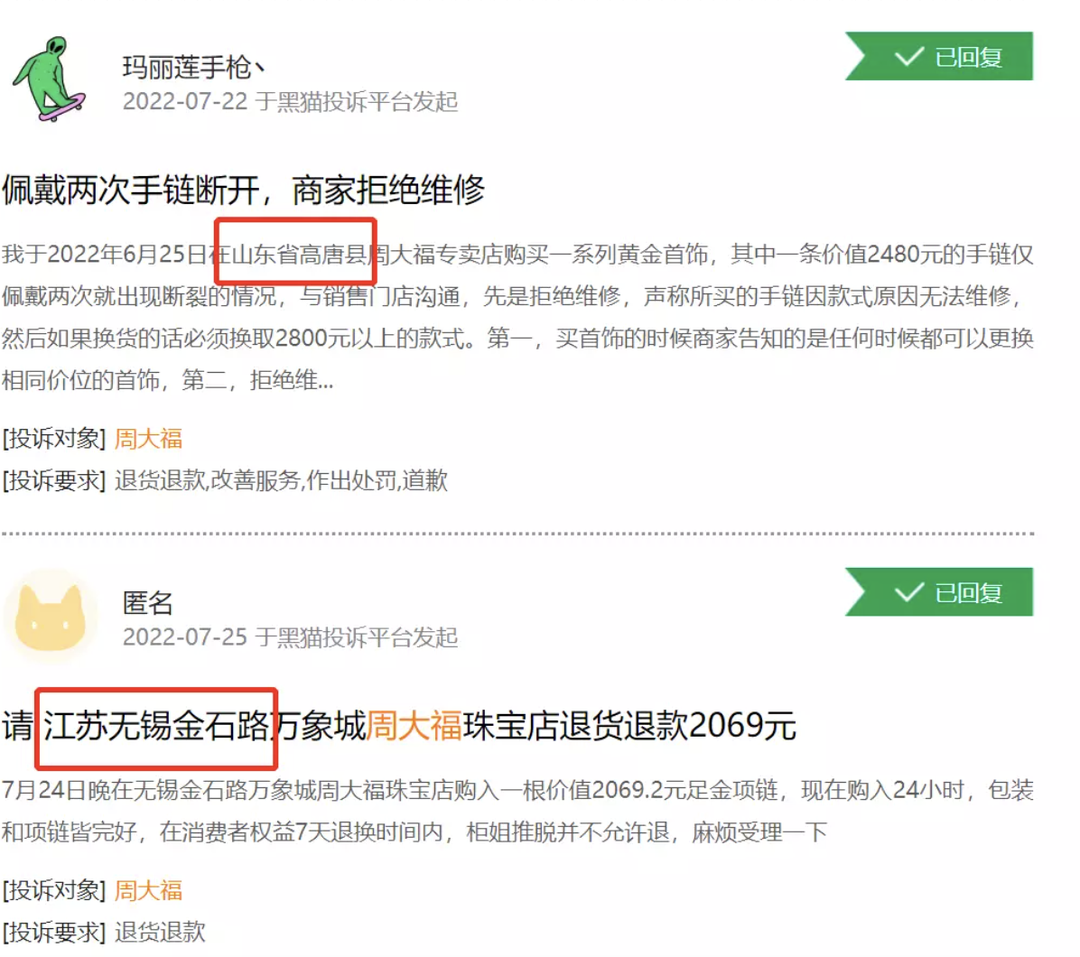 另一方面,已經(jīng)將自己包裝成奢侈品的周大福,進(jìn)入下沉市場(chǎng)后,如何約束加盟商,以及和直營店保持同水準(zhǔn)的服務(wù)水平也是一個(gè)巨大挑戰(zhàn)。截至今年8月,在黑貓投訴平臺(tái)上,周大福收到的投訴就高達(dá)1720條,投訴內(nèi)容大多為產(chǎn)品退換糾紛以及產(chǎn)品質(zhì)量問題,投訴門店多來自于二線以下城市甚至縣城。