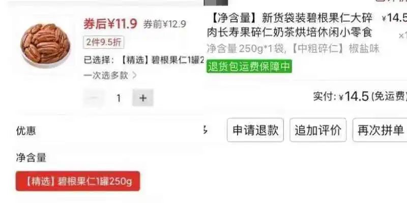 一開始還堅(jiān)持貨比三家的梓潼,時間一長,也形成了“邊角料=便宜”的刻板印象,直到反復(fù)刷到踩坑測評,梓潼忍不住翻出了自己的購買記錄,認(rèn)真算了下價(jià)格才發(fā)現(xiàn)自己買的碧根果碎仁被妥妥地割了“韭菜”,“我買的果仁碎14.5元/250克,味道是可以的,就是果仁有點(diǎn)太碎了,但另一家拼多多上銷量很高的堅(jiān)果商家,完整果仁才11.9元/250克!