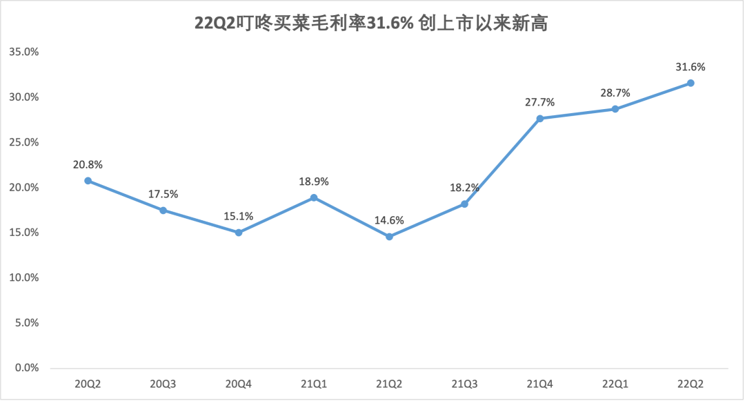 22Q2叮咚買菜毛利率31.6%比去年同期提升了17個(gè)百分點(diǎn),環(huán)比一季度提升2.9個(gè)百分點(diǎn)。